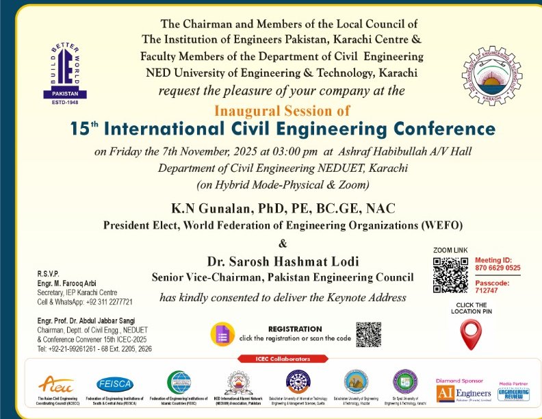 The 15th International Civil Engineering Conference (ICEC-2025) will commence tomorrow (November 7, 2025) at NED University of Engineering and Technology, Karachi. The event is jointly organized by the Institution of Engineers Pakistan (IEP) Karachi Centre and the Department of Civil Engineering, NED University. It will be held in hybrid mode (physical and online) at the Ashraf Habibullah A/V Hall.